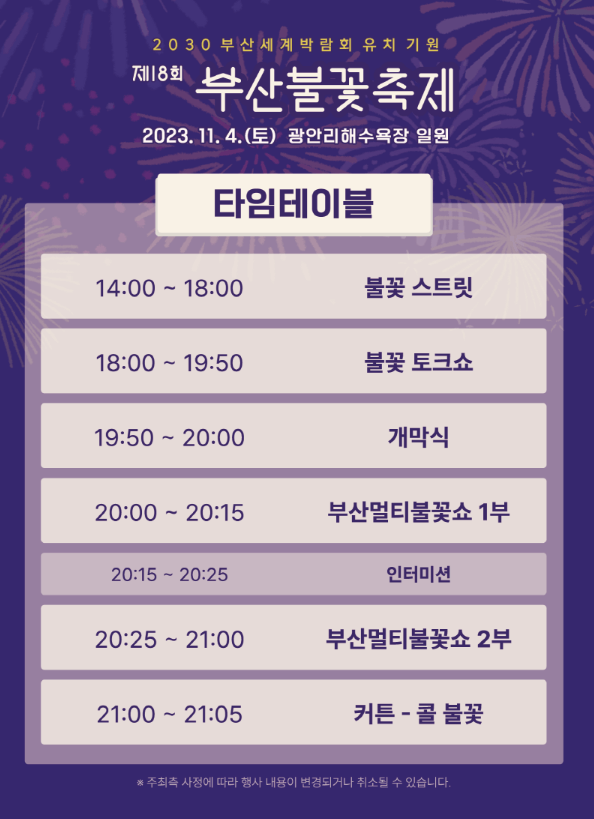 11월 4일 (토) 부산 불꽃축제가 진행됩니다. 이번 축제는 2030 부산세계박람회 유치기원을 담아 진행한다고 합니다.