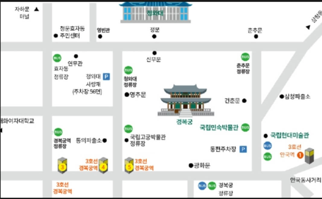 버 스 이 용 : 경복궁역 3번 출구 앞 "경복궁역 정류장" 1020, 1711 ,7016, 7018, 7212번 버스 탑승