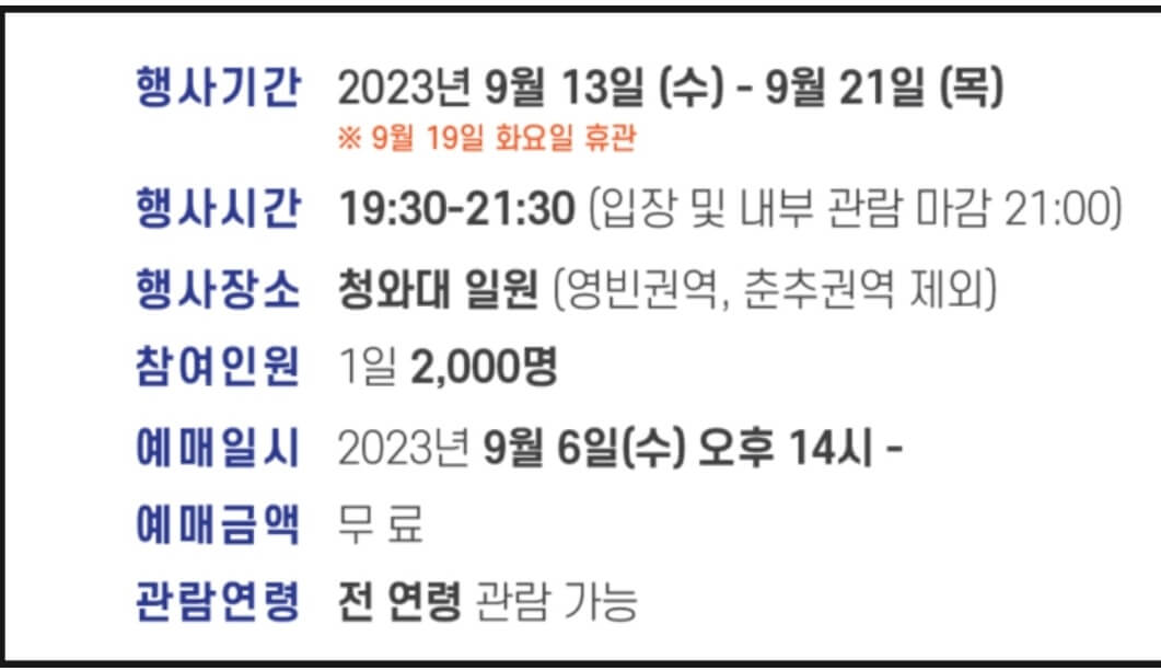 청와대 밤의 산책은 야간에 진행되는 행사입니다. 예매를 하신 분만 야간관람이 가능하며, 1인당 6매까지 예약 가능합니다. 예약 후 가족과 지인 간 양도는 가능하다고 합니다. 본관도 충무실, 세종실만 제외되고 관람이 가능하다고 합니다. 청와대를 돌아보는 소요시간은 여유롭게 잡으면 1시간 30분 정도 소요됩니다. 반려동물 동반 입장도 가능하나 내부 관람은 불가하다고 하오니 참고시면 좋을 거 같습니다. 청와대 순환 버스는 야간행사에는 운영하지 않습니다. 이러한 국민 행사일수록 주요 사항은 숙지하셔서 불편을 겪지 않으시는 게 중요