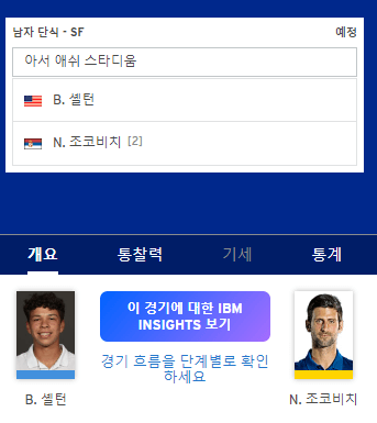 조코비치와 벤 쉘턴은 노련한 조코비치와 패기의 대결인 거 같다. 조코비치가 무난히 승리할 걸로 예상된다.